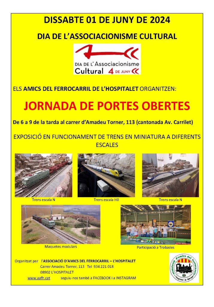 El dissabte 1 de juny de 18 a 21 hores, al local social de l’Associació, al carrer Amadeu Torner, 113, de L’Hospitalet, Jornada de Portes Obertes. Podeu portar amics i gaudir plegats de la jornada. Us hi esperen!! Circulació de trens de totes les èpoques.