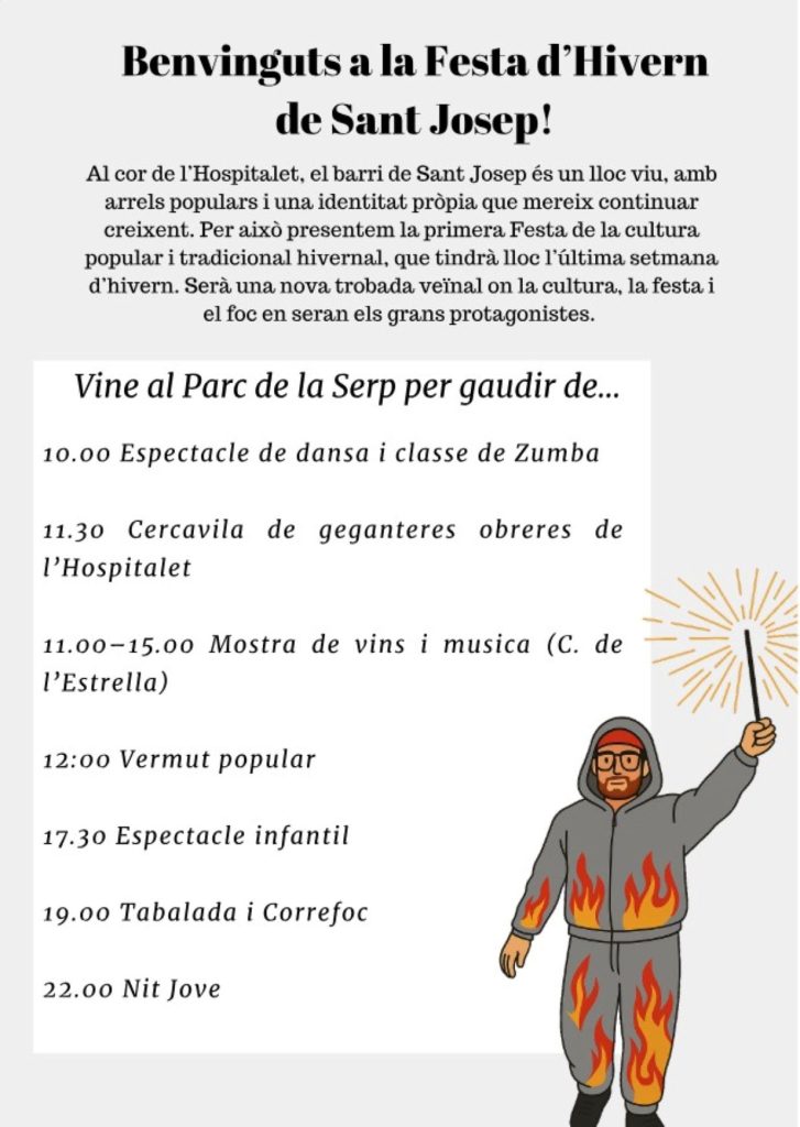 Aquest dissabte 14 de març, al Parc de la Serp, al barri de Sant Josep de L’Hospitalet se celebra la Festa d’Hivern, amb els Gegants, una Mostra de Vins, Vermut, Correfoc i Música.