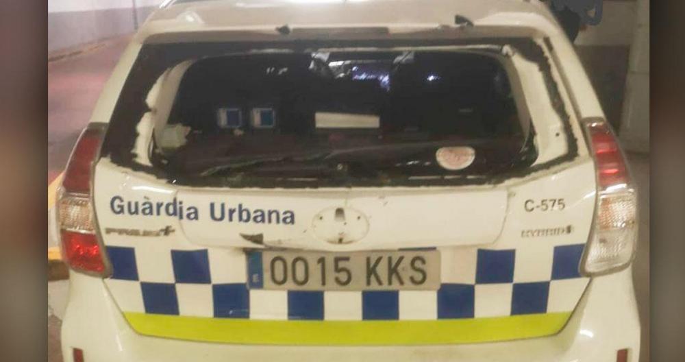 Un coche de Guardia Urbana que escoltaba a una presunta víctima, destrozado por los violentos que participaban en los disturbios en la ciudad
