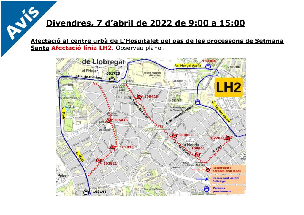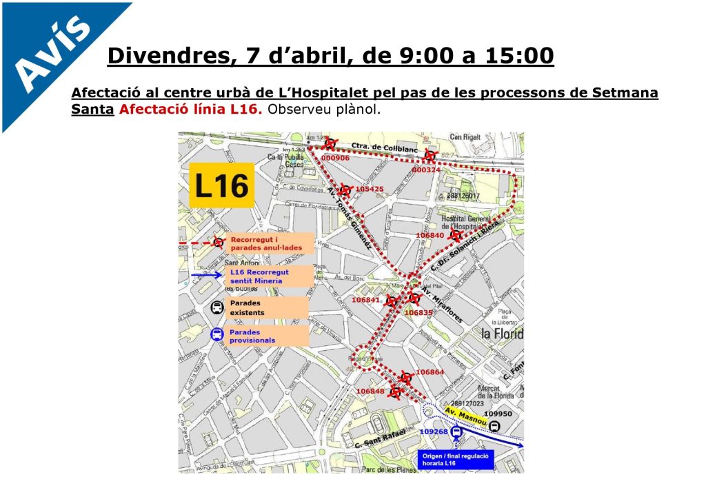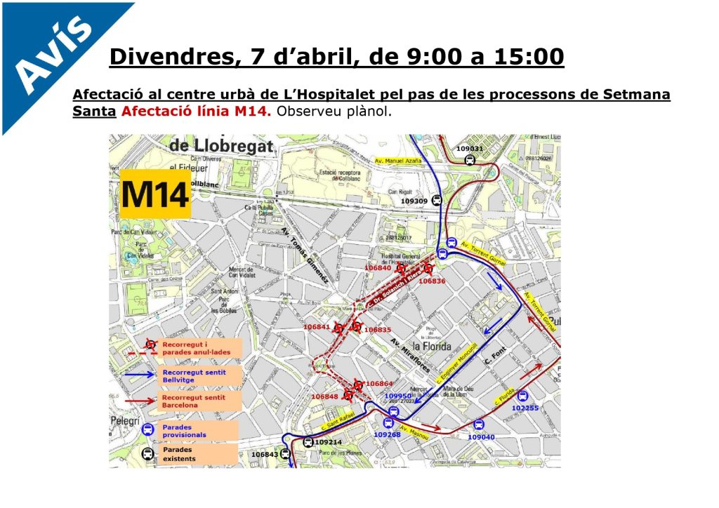 Las líneas de bus LH2, M14 y L16 cambian este viernes su recorrido habitual a causa del paso de las procesiones de Setmana Santa. De 9 a 15h.