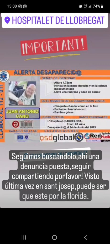Puede sufrir una cierta desorientación. Mide 1,70, viste chaqueta chandal, tiene una herida en la cabeza y en una de las manos. Lleva bambas grises y pantalón chandal oscuro. Se llama Juan Antonio Cano, y su familia lo busca. Va indocumentado. Se ha puesto denuncia a los Mossos.