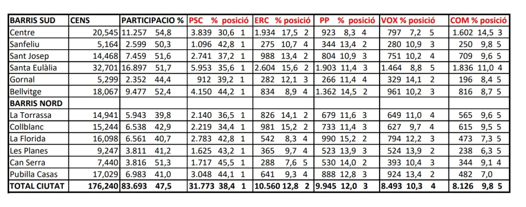 A nivel de la ciudad de L’Hospitalet las cifras confirman este criterio. El PSC fue el primer partido en los doce barrios de L’Hospitalet y los cinco partidos que consiguieron concejales fueron las candidaturas más votadas en todos los barrios, aunque con un orden diferente del registrado en el conjunto de la ciudad. Así, pues, el PSC ganó en todos los barrios pero el PP fue la segunda fuerza en cuatro barrios de la ciudad, mientras que VOX fue segunda fuerza en tres barrios de la ciudad.