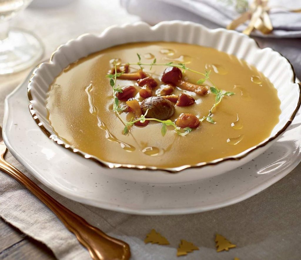 El sabor y textura de la crema de castañas y setas es muy especial. Puede convertirse en un primer plato estrella, en más de una celebración especial. Es sencilla y se puede elaborar con antelación. Tiempo: 1 hora